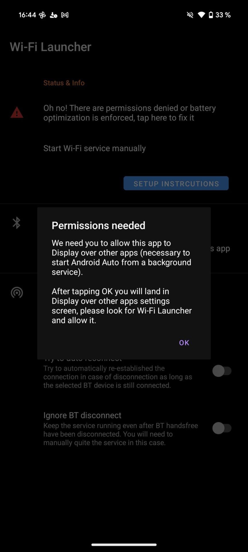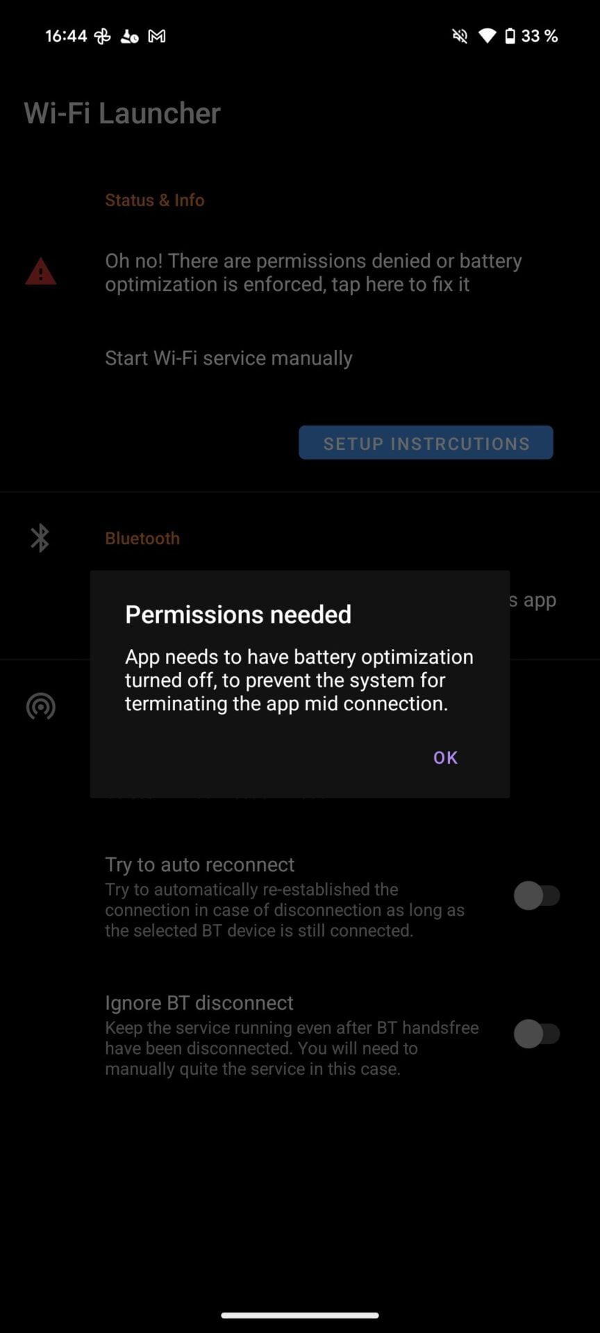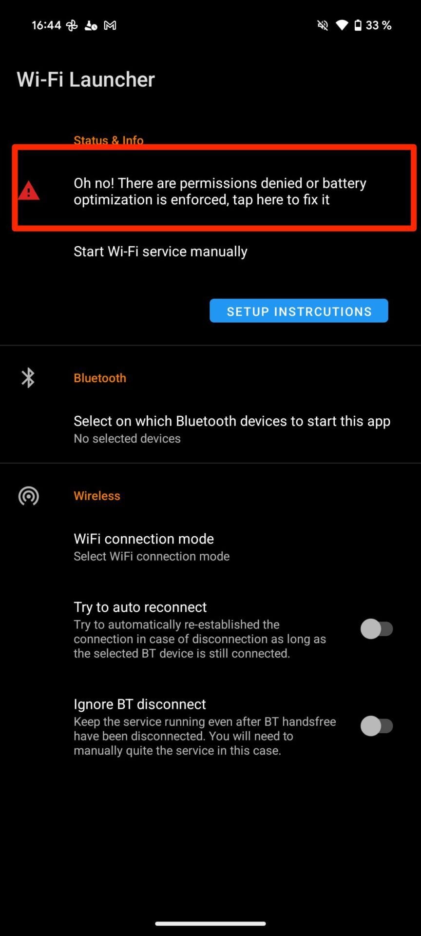 Par défaut, votre tablette sous Android 10 ou supérieur utilise sans doute le module d’optimisation de la batterie. Si c’est le cas, vous devriez voir s’afficher le message « Oh no ! There are permissions denied or battery optimization is enfroced, tap here to fix it ». Appuyez donc sur ce message, et accordez toutes les autorisations demandées par l’application.