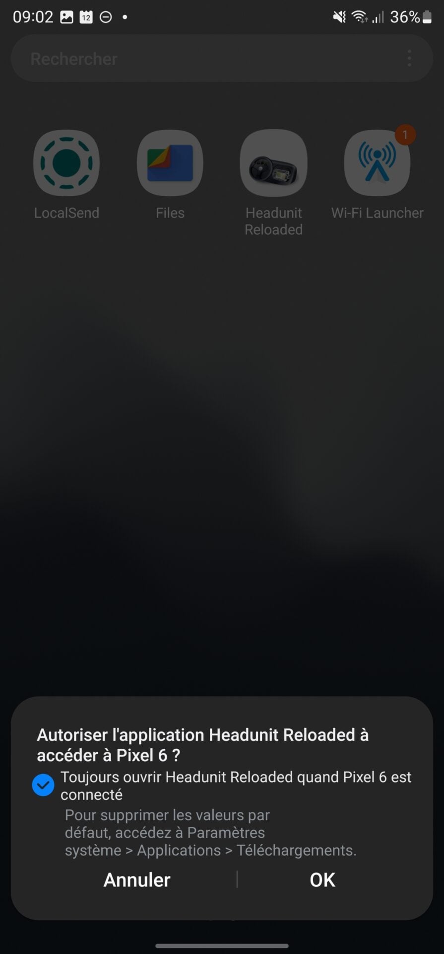 Un nouveau pop-up Autoriser l’application Headunit Reloaded à accéder à NomDeVotreSmartphone s’affiche. Cochez la case Toujours ouvrir Headunit Reloaded quand NomDeVotreSmartphone est connecté et appuyez sur OK. Un autre menu Sélectionner une application pour le périphérique USB peut s’afficher en surimpression. Sélectionnez Headunit Reloaded et appuyez sur Toujours.