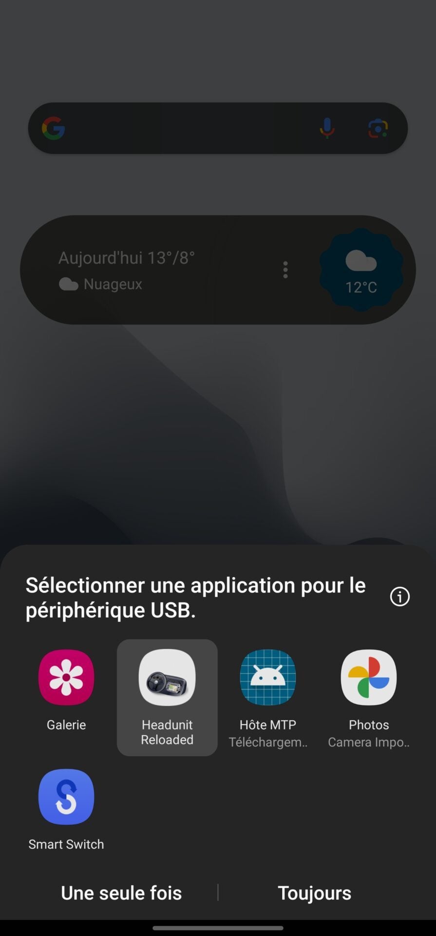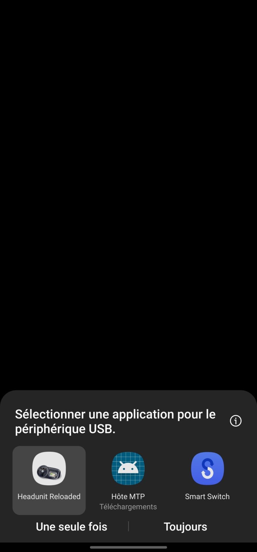 Votre tablette devrait alors afficher un pop-up Sélectionnez une application pour le périphérique USB. Choisissez Headunit Reloaded et appuyez sur Toujours.
