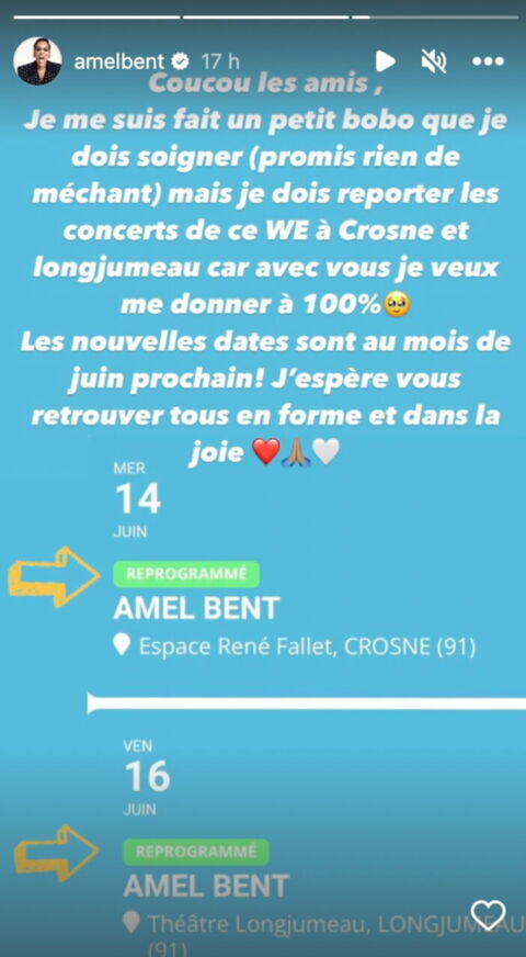 C’est donc avec son éternelle sincérité qu’Amel Bent a pris la parole sur Instagram ce 14 mars pour annoncer une mauvaise nouvelle à ses fans. Elle va devoir reporter deux dates de concerts prévus ce week-end. « Je me suis fait un petit bobo que je dois soigner. Je dois reporter les concerts de ce week-end à Crosne et Longjumeau car avec vous, je veux me donner à 100%. Les nouvelles dates sont au mois de juin prochain ! J’espère vous retrouver tous en forme et dans la joie« , a déclaré la chanteuse, promettant que ce bobo n’est “rien de méchant”. Tous les fans de la star espèrent qu’elle va rapidement être remise sur pied !